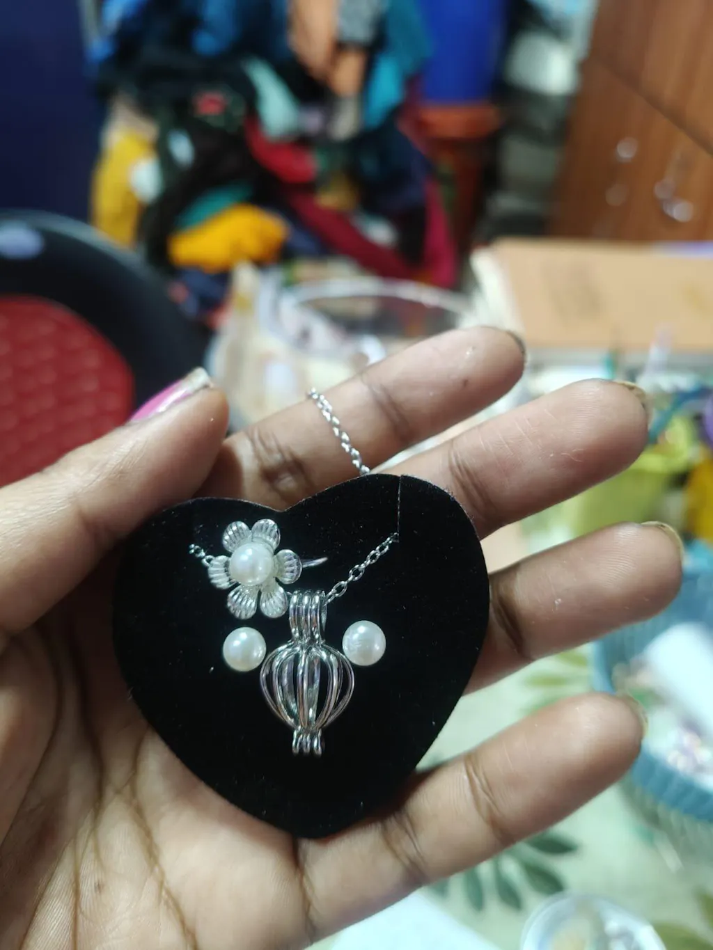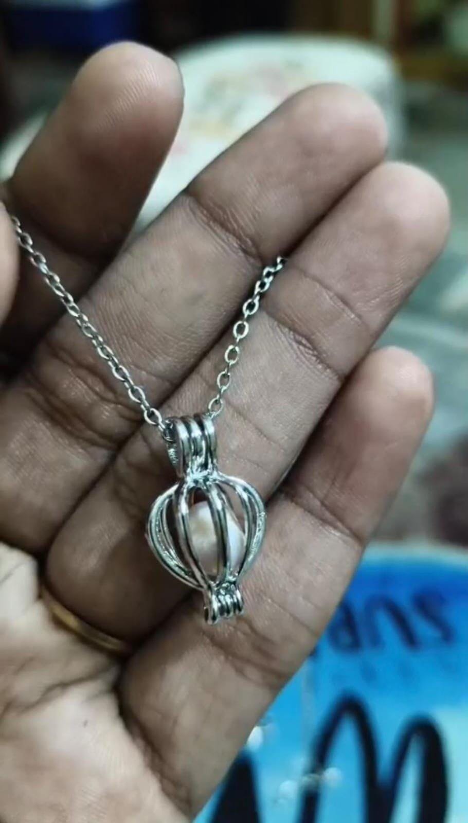 Materials: natural shell (oyster), freshwater pearl, metal cage + chain